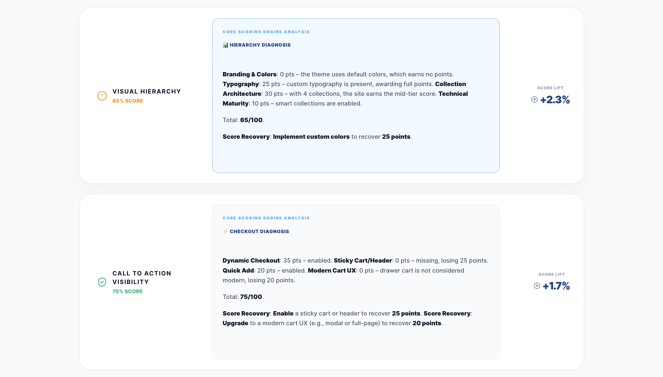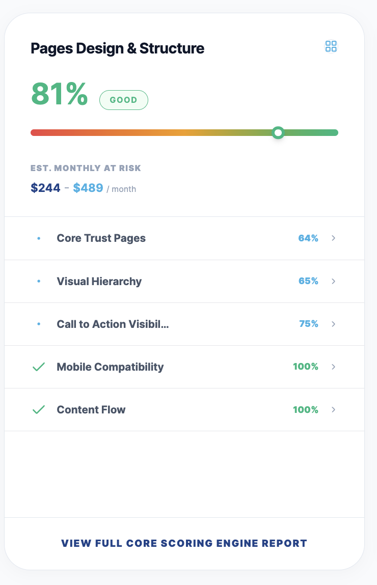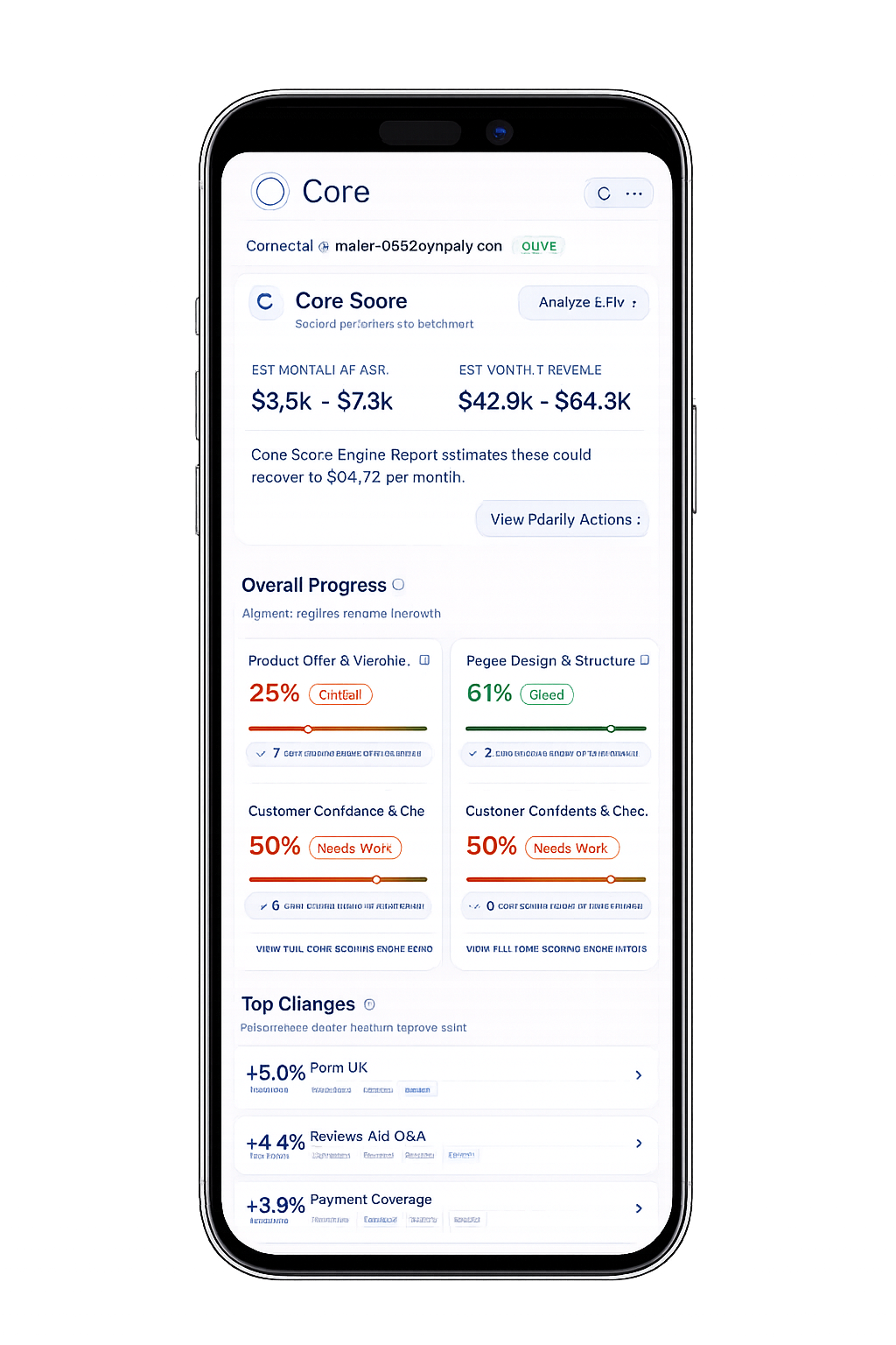 Navigation, layout clarity, trust signals, mobile experience. Core maps every friction point between your visitor and the checkout button.