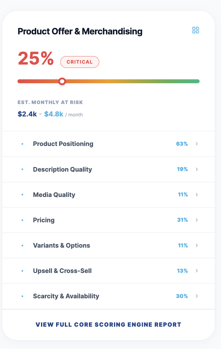 Core audits every product across three dimensions — the same framework used by top commerce consultancies, built into a tool you own.
